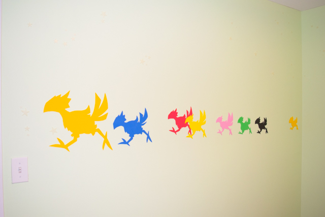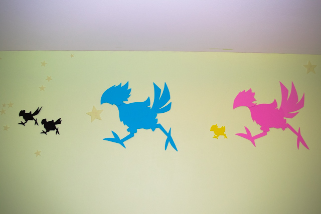 Phoenix currently has the nicest room in our newly purchased house. It is light green themed with chocobos, moogles, and other Final Fantasy characters.