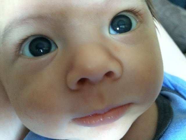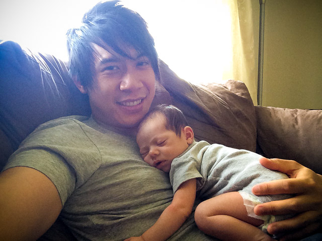 His first smile at three weeks old was in the baby swing while Jian was playing with him.